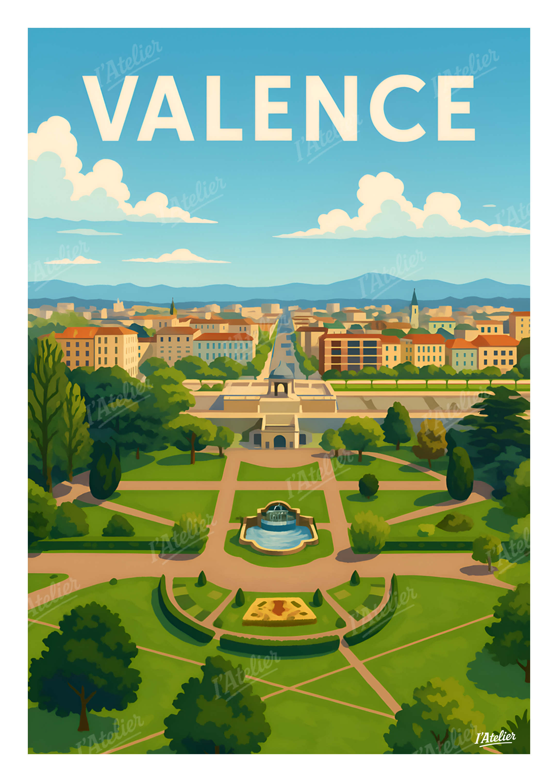 Plongez au cœur de Valence avec cette affiche décorative de I’Atelier, un poster vintage qui révèle toute la douceur méridionale de cette ville emblématique de la Drôme. Au premier regard, la vue se déploie depuis les jardins lumineux du Champ de Mars : allées symétriques, fontaine élégante, arbres généreux et perspective apaisante vers les toits colorés de la ville. L’ensemble évoque la quiétude d’une promenade estivale, le souffle chaud du vent du Sud et cette harmonie urbaine bercée par la lumière claire de la vallée du Rhône. Cette illustration au style vintage est imprimée en France sur un papier Mat haute qualité 170 g/m². Elle apporte à votre intérieur une atmosphère douce, lumineuse et contemporaine, idéale pour personnaliser un salon, une chambre ou tout espace inspiré du Sud. Laissez entrer l’élégance graphique et le charme intemporel de Valence dans votre décoration murale.