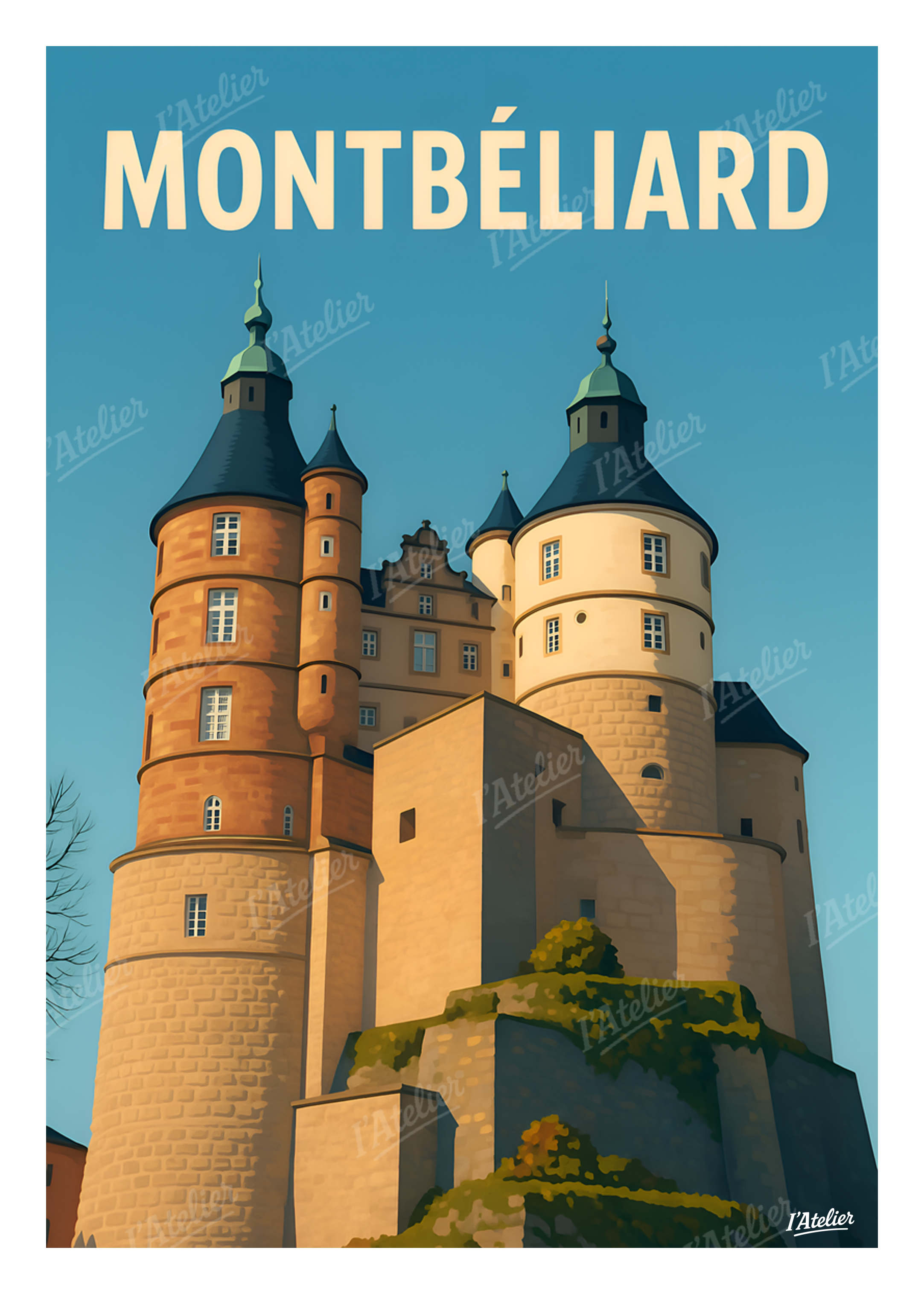 Plongez dans l’atmosphère envoûtante de Montbéliard avec cette affiche vintage Montbéliard signée I’Atelier, une illustration qui met en lumière l’élégance du célèbre château dominant la ville, sous un ciel clair aux teintes douces. Entre ses tours élancées, ses murs chargés d’histoire et la lumière qui caresse la pierre, la scène évoque la quiétude d’une cité où se mêlent héritage princier et douceur de vivre. Un décor qui capture l’âme du Pays de Montbéliard, entre charme architectural et sérénité franc-comtoise. Cette illustration au style vintage est imprimée en France sur un papier Mat haute qualité 170 g/m². Elle apporte à votre intérieur une atmosphère douce, lumineuse et harmonieuse, idéale pour personnaliser un salon, une chambre ou tout espace inspiré d’une décoration murale élégante. Invitez la majesté du château de Montbéliard dans votre intérieur avec cette illustration rétro de I’Atelier.