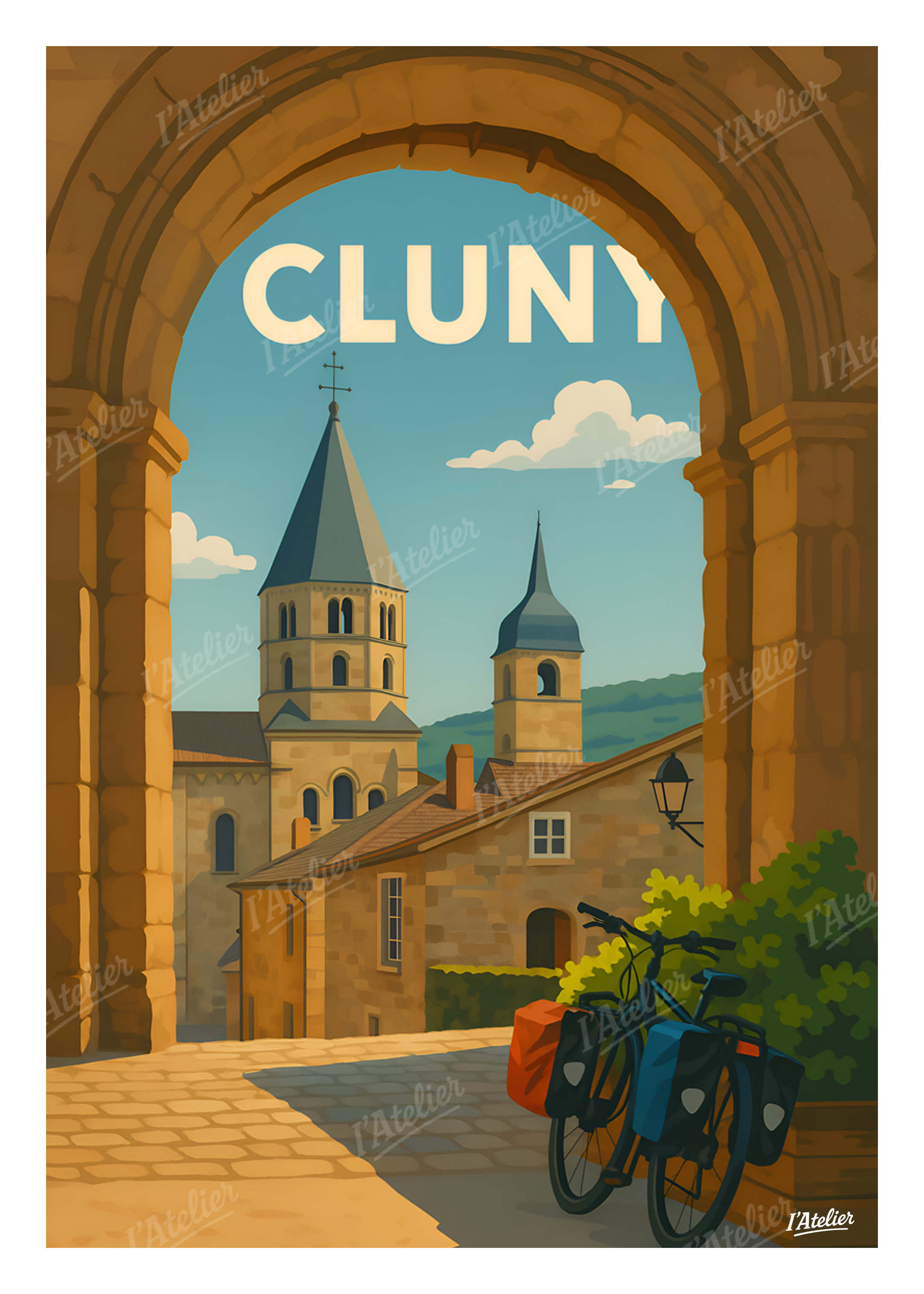 Plongez au cœur de Cluny avec cette affiche Cluny signée I’Atelier, une création qui rend hommage à l’atmosphère unique de cette cité bourguignonne, entre architecture millénaire et douceur de vie. Sous les arches chaleureuses de la ville, les toits ocres, les tours majestueuses de l’ancienne abbaye et les vélos prêts à filer évoquent une escapade paisible au rythme des ruelles médiévales. Une scène baignée de lumière calme, où l’on ressent le souffle de l’histoire et le charme discret de la campagne environnante. Cette illustration au style vintage est imprimée en France sur un papier Mat haute qualité 170 g/m². Elle apporte à votre intérieur une atmosphère douce, lumineuse et harmonieuse, idéale pour personnaliser un salon, une chambre ou tout espace inspiré de vos voyages. Apportez une touche d’élégance bourguignonne à votre décoration murale grâce à ce poster vintage Cluny signé I’Atelier.