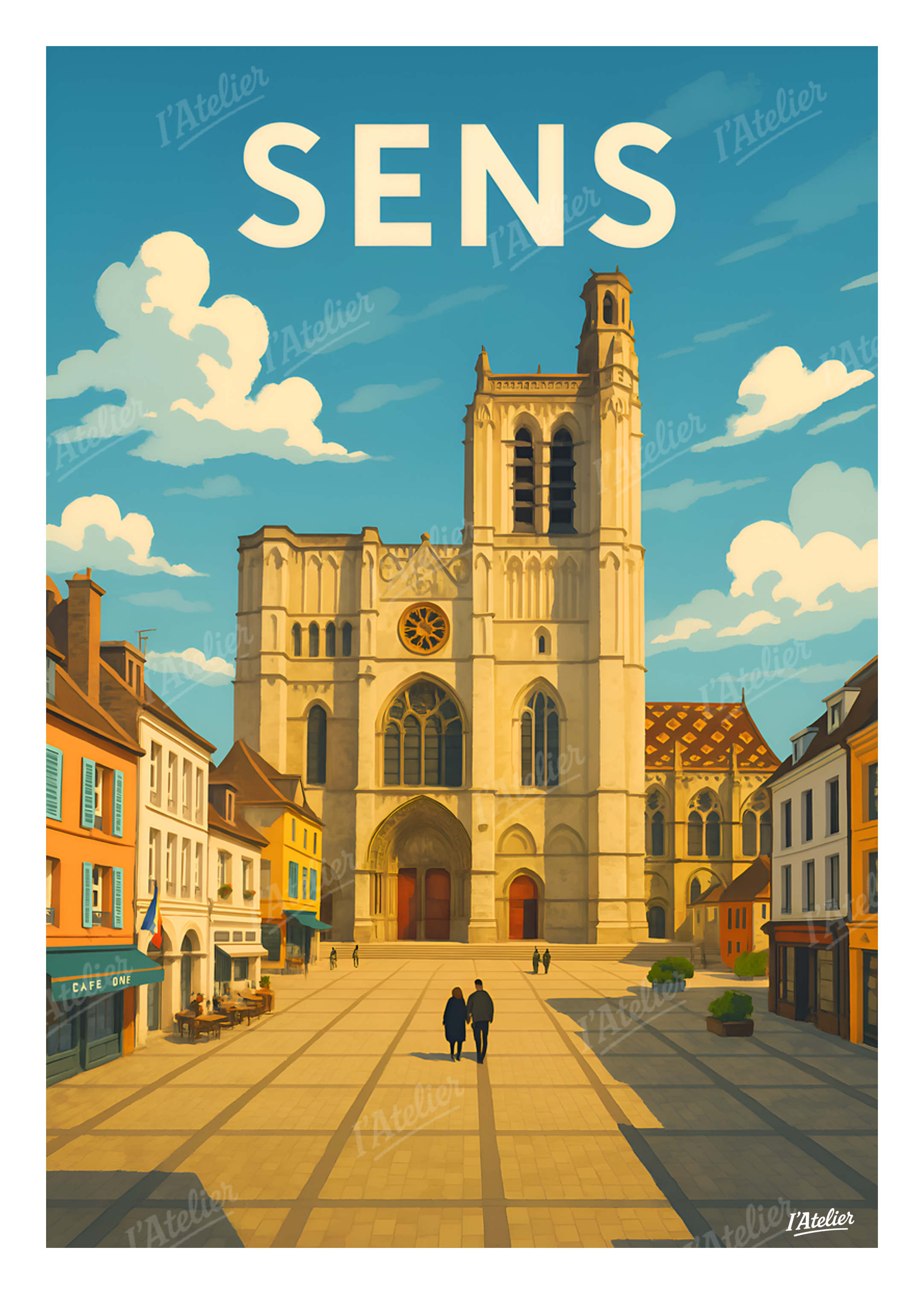 Plongez au cœur de Sens, charmante ville de Bourgogne, avec cette affiche décorative de I’Atelier qui met en lumière la majestueuse cathédrale Saint-Étienne sous un ciel lumineux, symbole intemporel du patrimoine local et de la douceur de vivre régionale. Entre façades colorées, pavés baignés de soleil et silhouettes flânant vers la place centrale, cette scène évoque la tranquillité des matinées bourguignonnes, l’écho des cloches et la poésie des ruelles anciennes. Une ambiance douce et urbaine, portée par la sérénité d’un centre historique qui invite à la promenade. Cette illustration au style vintage est imprimée en France sur un papier Mat haute qualité 170 g/m². Elle apporte à votre intérieur une atmosphère élégante, apaisante et lumineuse, idéale pour personnaliser un salon, une entrée ou tout espace inspiré par les voyages. Laissez entrer l’esprit de Sens dans votre maison grâce à cette illustration rétro signée I’Atelier.