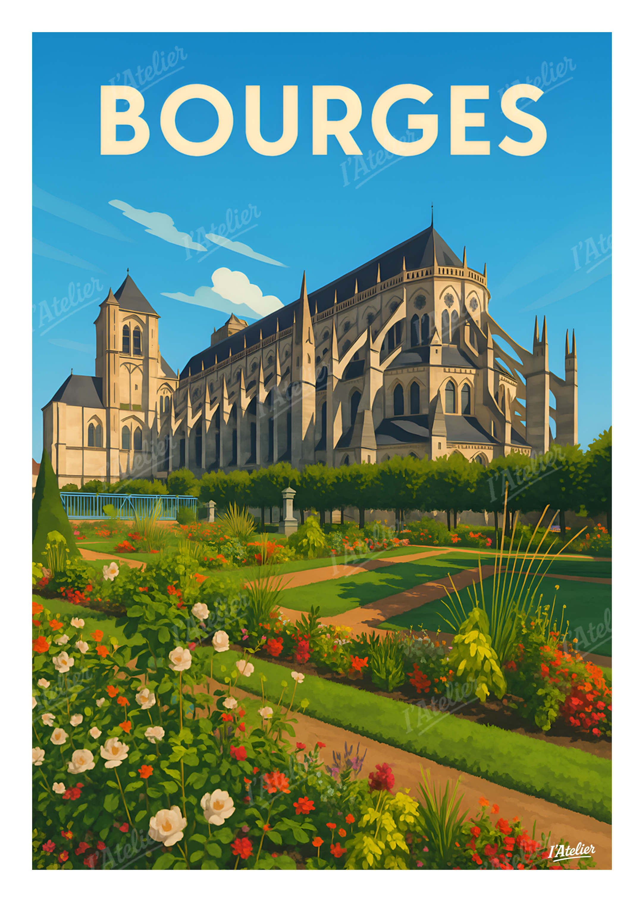 Plongez dans l’atmosphère envoûtante de Bourges avec cette affiche vintage de I’Atelier, une illustration qui met en lumière la majesté de sa cathédrale et le charme paisible de ses jardins en plein cœur du Berry. Entre les parterres fleuris, les allées baignées de soleil et l’architecture gothique qui se découpe dans un ciel limpide, la scène évoque la douceur d’une promenade estivale. On y ressent le calme des jardins, la fraîcheur de la pierre ancienne et cette lumière dorée qui sublime les détails du monument, comme une invitation à flâner et à s’évader. Cette illustration au style vintage est imprimée en France sur un papier Mat haute qualité 170 g/m². Elle apporte à votre intérieur une atmosphère élégante, lumineuse et apaisante, idéale pour personnaliser un salon, une chambre ou tout espace inspiré par l’histoire et la beauté des villes françaises. Apportez une touche de charme patrimonial à votre décoration grâce à cette illustration rétro de Bourges signée I’Atelier.