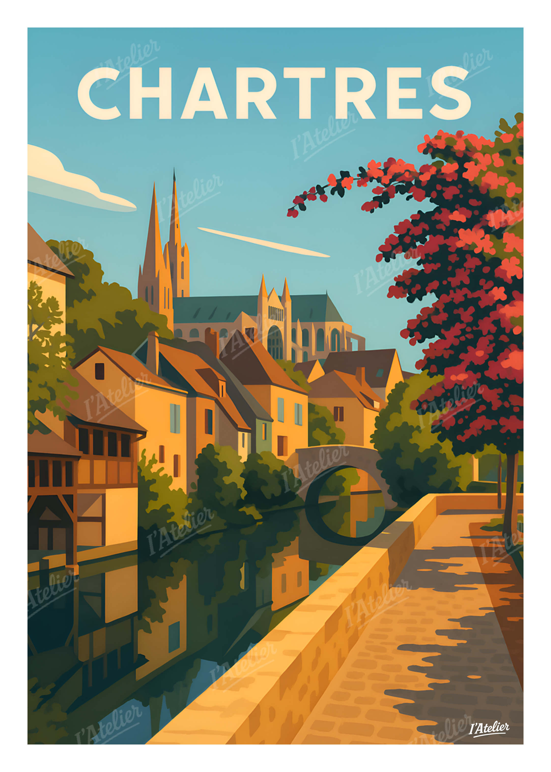 Plongez dans l’atmosphère lumineuse de Chartres avec cette affiche illustrée de I’Atelier, un poster vintage qui met à l’honneur la vieille ville, ses quais paisibles et la silhouette emblématique de la cathédrale. Entre ruelles bordées de maisons anciennes, reflet calme de l’Eure et jeu d’ombres au pied des pierres médiévales, cette scène évoque la sérénité d’une promenade au crépuscule. Une ambiance douce et contemplative, pensée pour ceux qui aiment les villes au charme historique et les instants suspendus. Cette illustration au style vintage est imprimée en France sur un papier Mat haute qualité 170 g/m². Elle apporte à votre intérieur une atmosphère douce, élégante et lumineuse, idéale pour personnaliser un salon, un bureau ou toute décoration murale inspirée par les villes d’art. Apportez une touche de poésie chartraine à votre intérieur avec cette illustration rétro signée I’Atelier.