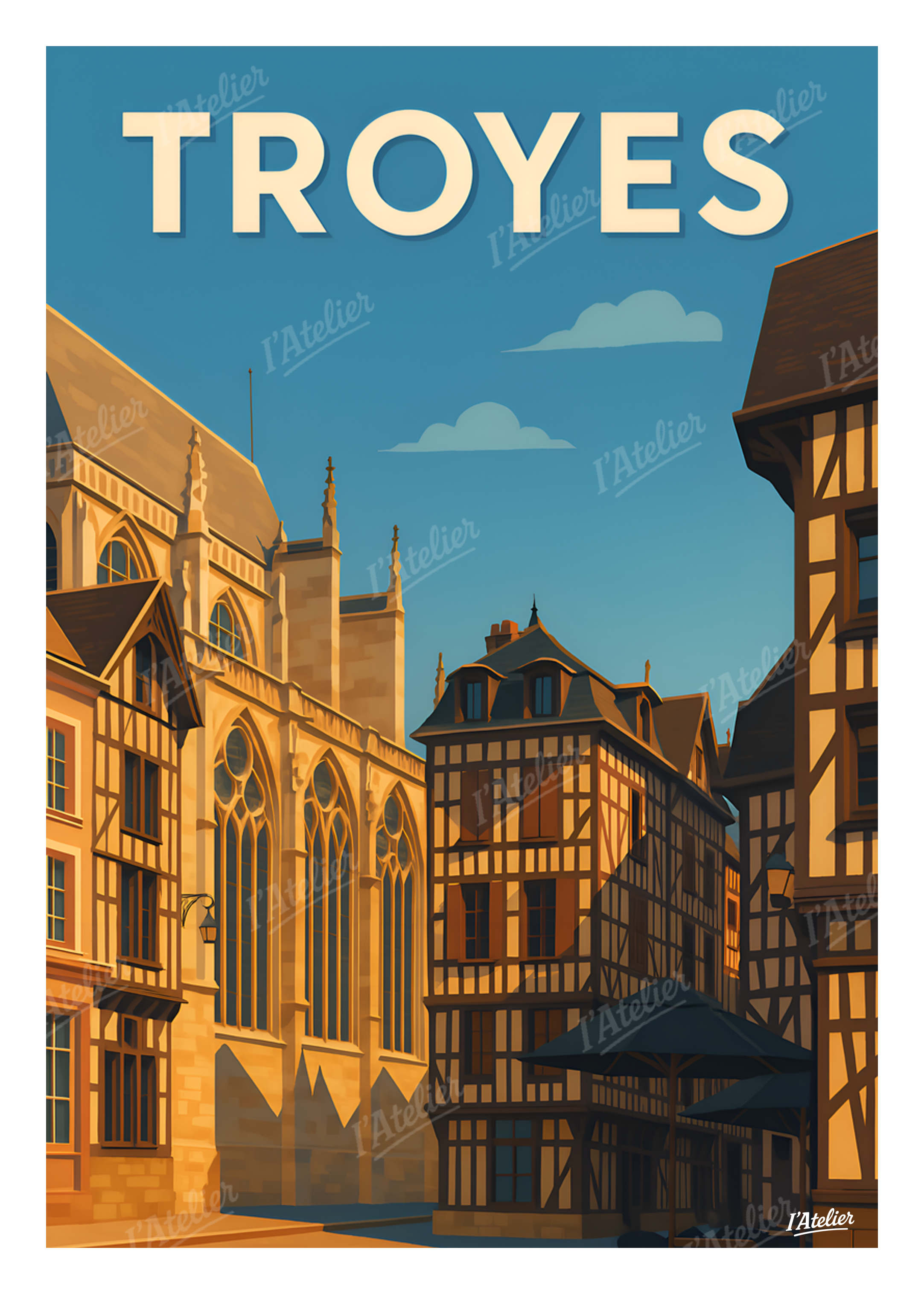 Plongez dans l’atmosphère singulière de Troyes avec cette affiche Troyes signée I’Atelier, une création qui met en lumière le charme médiéval de la ville à travers ses façades à pans de bois et la silhouette lumineuse de son architecture gothique. Dans la douceur d’une fin d’après-midi, les maisons colorées se mêlent aux jeux d’ombre et de lumière, tandis que les ruelles étroites semblent inviter à une flânerie paisible. On y ressent la quiétude des vieilles pierres, le murmure des terrasses qui s’éveillent, et la poésie discrète de cette cité chargée d’histoire. Cette illustration au style vintage est imprimée en France sur un papier Mat haute qualité 170 g/m². Elle apporte à votre intérieur une atmosphère élégante, authentique et lumineuse, idéale pour personnaliser un salon, une chambre ou tout espace inspiré des voyages. Apportez une touche de charme champenois à votre décoration murale grâce à cette illustration rétro dédiée à Troyes.