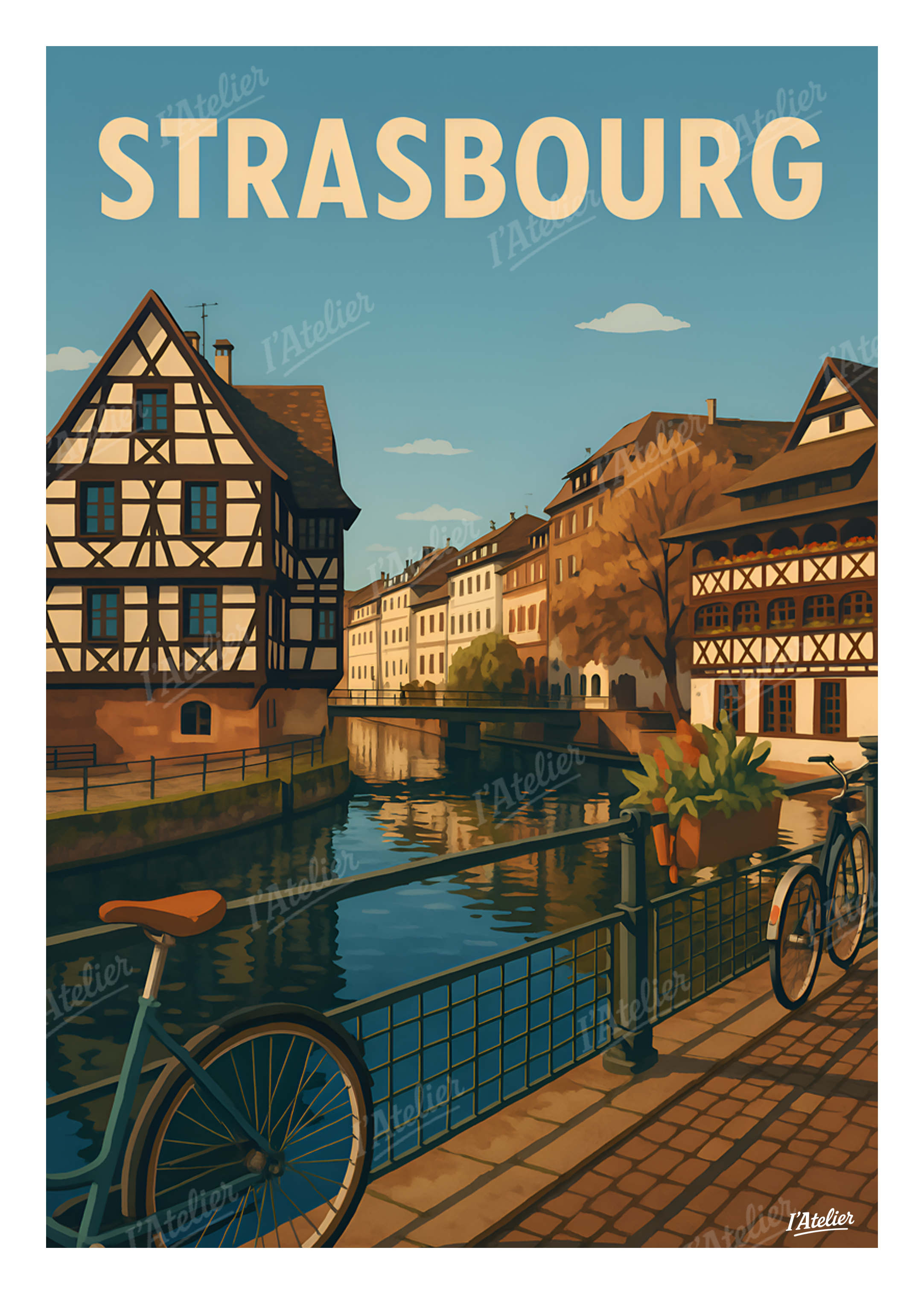 Plongez au cœur de Strasbourg avec cette affiche vintage de I’Atelier, une illustration qui dévoile le charme intemporel des canaux de la Petite France, parfaite pour une décoration murale élégante et pleine de caractère. Entre maisons à colombages, reflets paisibles sur l’eau et lumière douce d’une fin de journée, cette scène capture l’âme poétique de la ville. On y ressent la tranquillité des ruelles pavées, le murmure des vélos qui passent et la chaleur d’un quartier où le temps semble suspendu. Une atmosphère authentique qui évoque les balades au bord de l’Ill et l’art de vivre alsacien. Cette illustration au style vintage est imprimée en France sur un papier Mat haute qualité 170 g/m². Elle apporte à votre intérieur une atmosphère douce, lumineuse et harmonieuse, idéale pour personnaliser un salon, une chambre ou tout espace inspiré de voyages en Europe. Laissez entrer l’élégance de Strasbourg chez vous avec cette illustration rétro signée I’Atelier.