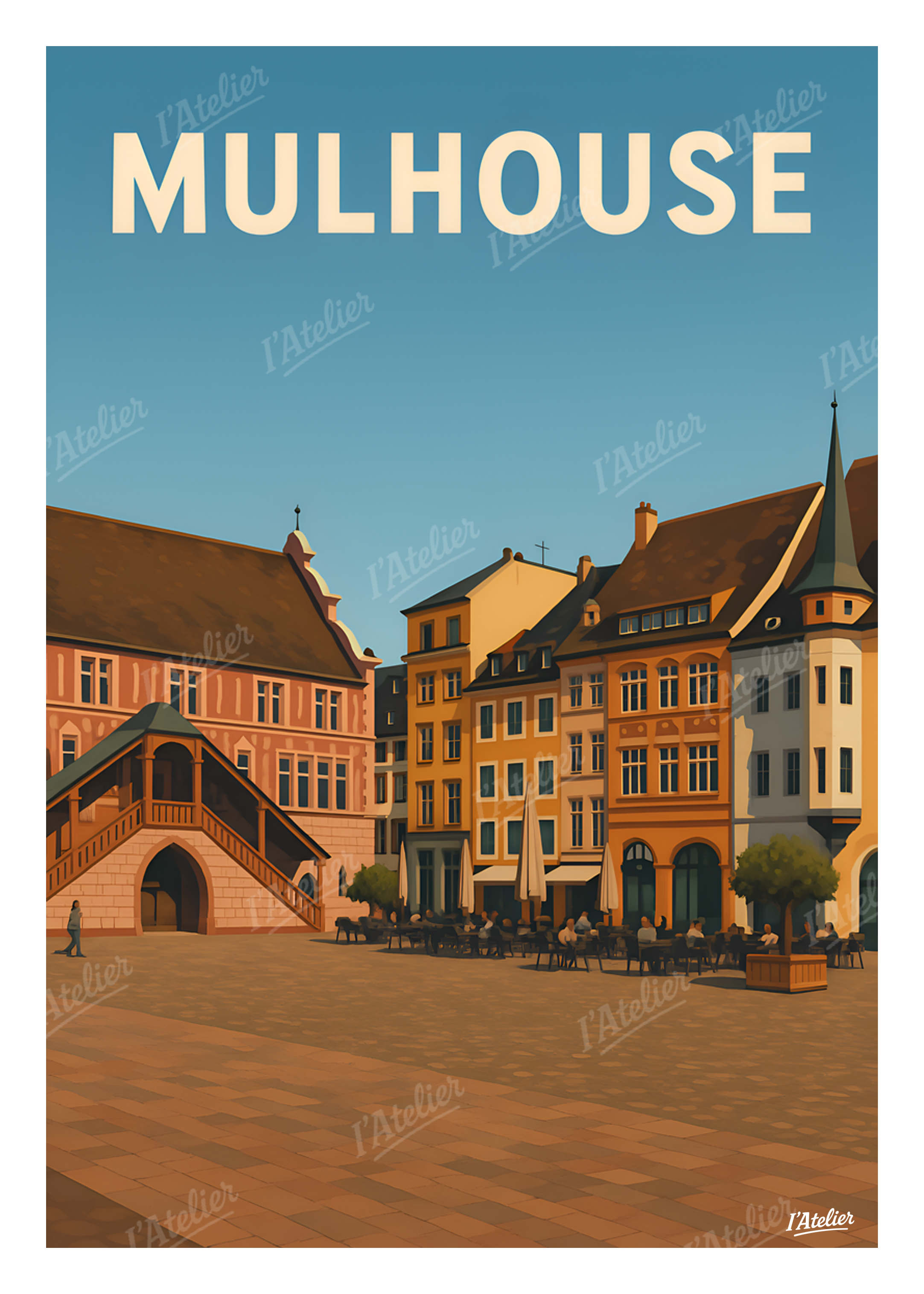 Plongez au cœur de Mulhouse, ville d’art et d’histoire, avec cette affiche Mulhouse de I’Atelier, une illustration lumineuse qui révèle la beauté de sa place centrale et l’élégance de son patrimoine architectural. Entre façades colorées, terrasses animées et lumière douce du soir, ce poster vintage Mulhouse évoque le charme d’une ville au caractère authentique, où l’on flâne entre les arcades, les ruelles pavées et les silhouettes typiques de l’Alsace. Une scène apaisante, empreinte de convivialité et de clarté, idéale pour enrichir votre décoration murale d’une touche urbaine et chaleureuse. Cette illustration au style vintage est imprimée en France sur un papier Mat haute qualité 170 g/m². Elle apporte à votre intérieur une atmosphère douce, élégante et lumineuse, idéale pour personnaliser un salon, une chambre ou tout espace inspiré par l’Alsace. Apportez le charme alsacien à votre intérieur grâce à cette illustration rétro signée I’Atelier.