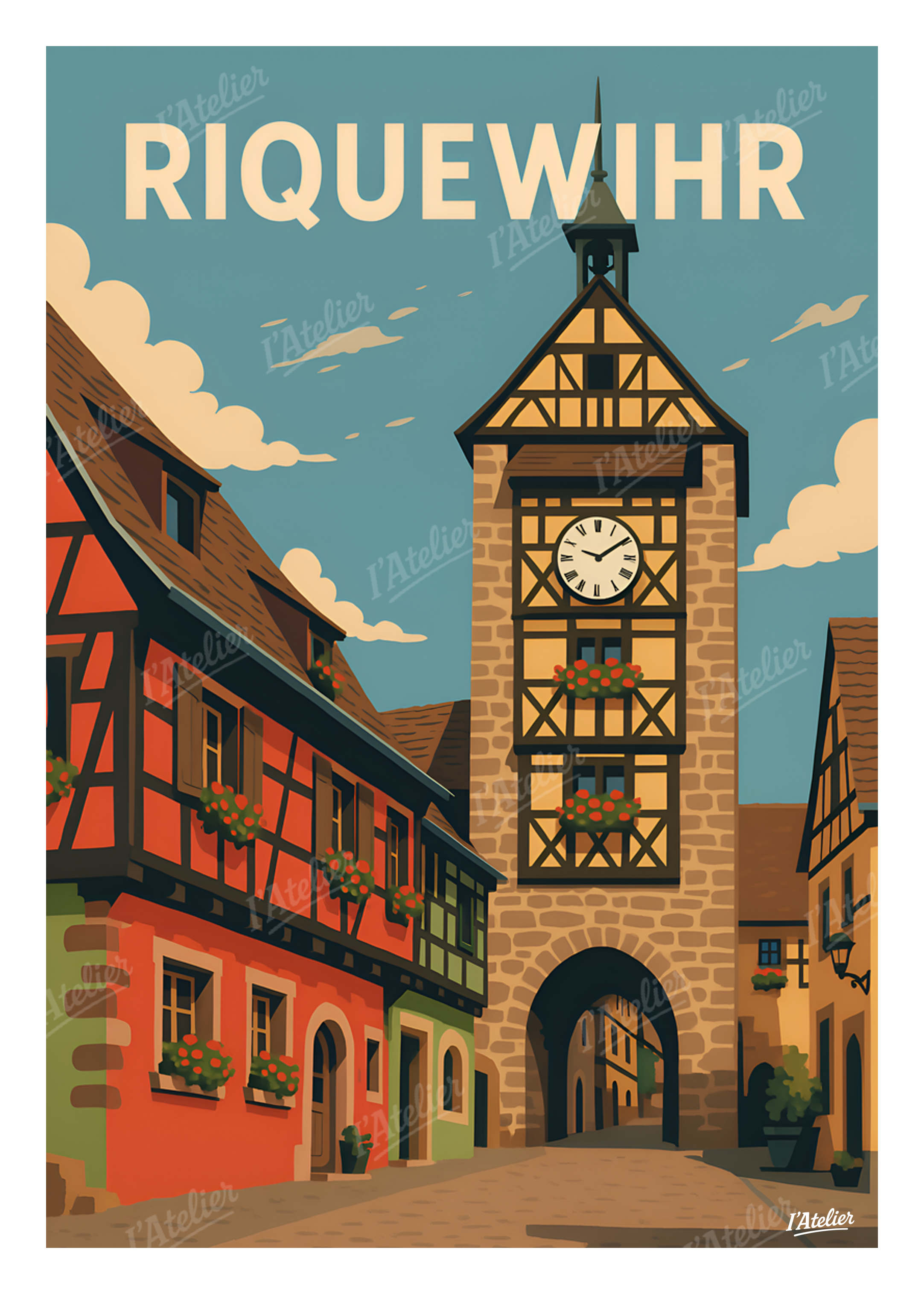 Plongez au cœur de Riquewihr, village alsacien au charme intemporel, avec cette affiche vintage de I’Atelier, une illustration rétro qui met en lumière ses ruelles pavées et ses maisons à colombages baignées de couleurs chaleureuses. Entre façades multicolores, géraniums débordants et la silhouette emblématique de la tour du Dolder, cette scène capture l’atmosphère paisible d’un village où le temps semble suspendu. On y devine l’odeur du bois ancien, la douceur d’une fin d’après-midi d’été et la poésie des villages de la Route des Vins, idéals pour une décoration murale élégante et évocatrice. Cette illustration au style vintage est imprimée en France sur un papier Mat haute qualité 170 g/m². Elle apporte à votre intérieur une atmosphère douce, authentique et lumineuse, idéale pour personnaliser un salon, une chambre ou tout espace inspiré des villages alsaciens. Apportez une touche de charme alsacien à votre intérieur avec cette affiche Riquewihr signée I’Atelier.