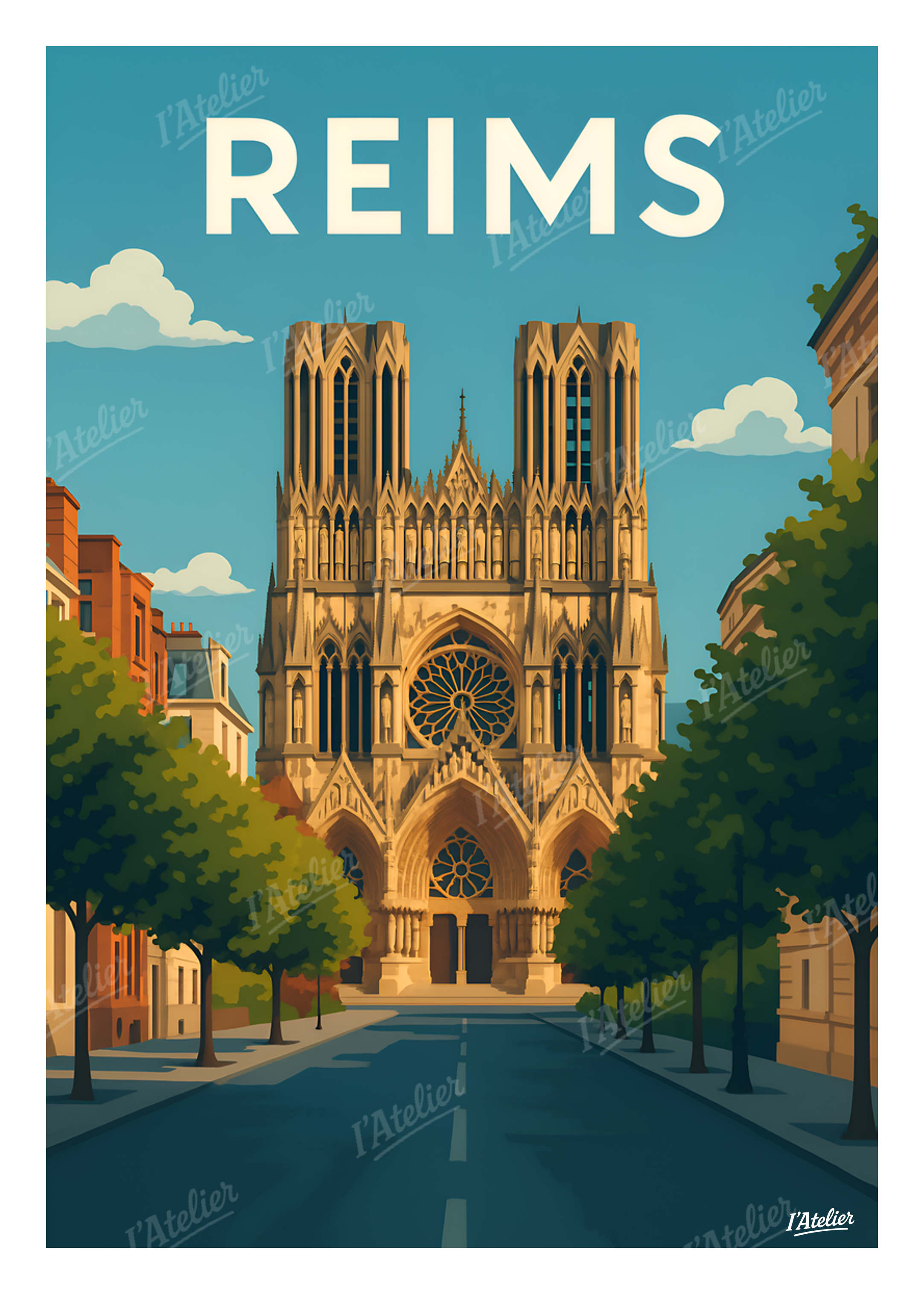 Plongez au cœur de Reims avec cette affiche vintage de I’Atelier, une illustration qui sublime la majestueuse cathédrale et l’atmosphère intemporelle de la cité des sacres, parfaite pour une affiche Reims ou un poster vintage Reims élégant et inspirant. Au détour d’une avenue bordée d’arbres, la silhouette gothique de la cathédrale se dresse, baignée par une lumière douce qui révèle ses détails sculptés. On y ressent le calme d’un matin clair, la résonance lointaine des pierres historiques et la poésie d’une ville où patrimoine et sérénité se mêlent délicatement. Une scène qui invite à la contemplation et à la découverte. Cette illustration au style vintage est imprimée en France sur un papier Mat haute qualité 170 g/m². Elle apporte à votre intérieur une atmosphère harmonieuse, lumineuse et raffinée, idéale pour personnaliser un salon, une chambre ou tout espace inspiré des grandes villes françaises. Apportez une touche d’élégance rémoise à votre décoration murale avec cette illustration rétro signée I’Atelier.