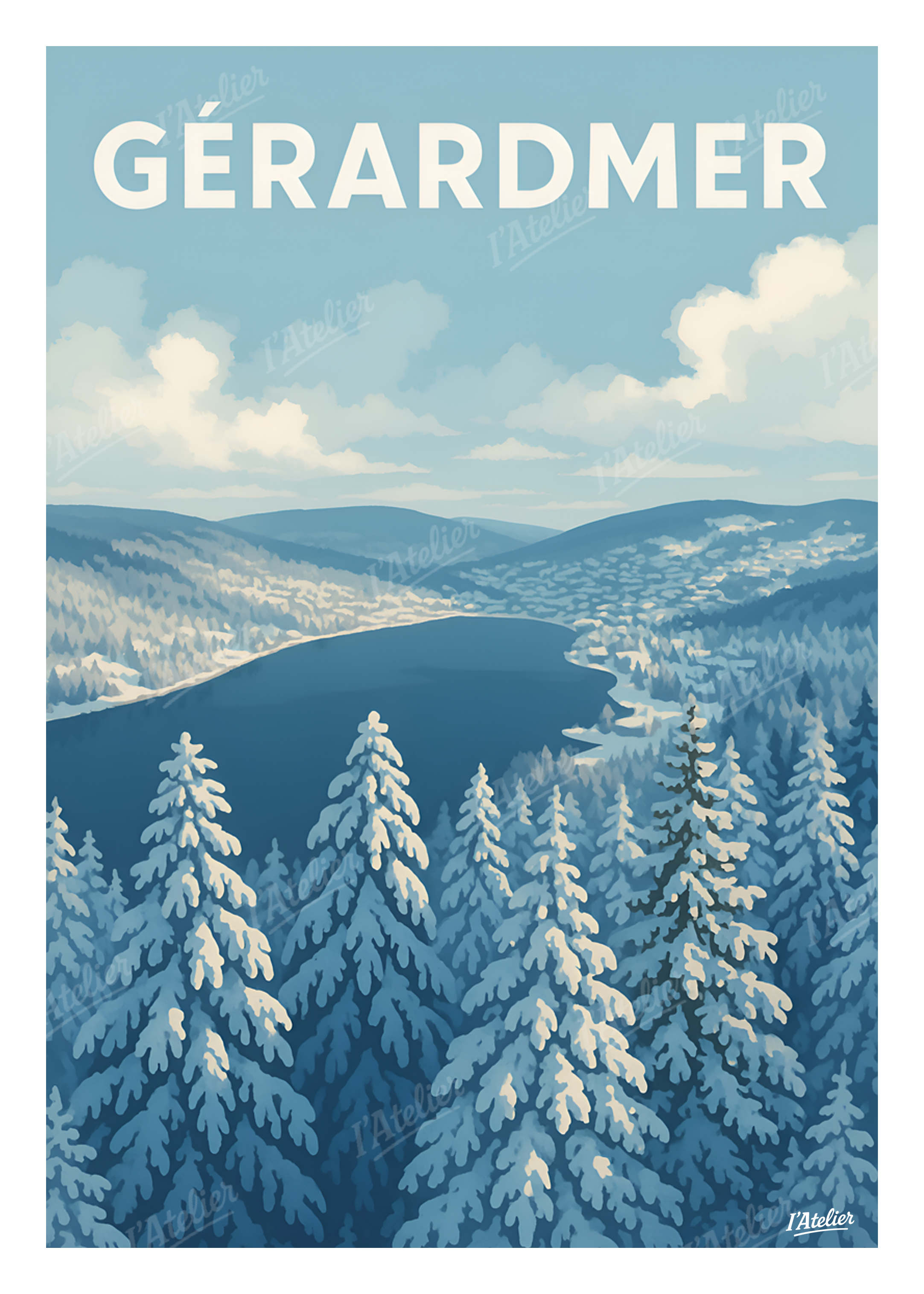 Plongez dans l’atmosphère hivernale des Vosges avec cette affiche Gérardmer de I’Atelier, un poster vintage qui met en lumière le charme paisible du lac et des forêts enneigées, parfait pour enrichir votre décoration murale d’une touche nordique. Entre reliefs bleutés, sapins chargés de neige et lumière douce des matinées d’hiver, cette illustration évoque le calme profond des paysages vosgiens, la fraîcheur de l’air montagnard et la sérénité d’un panorama figé dans la blancheur. Une ode à la nature, à la pureté et aux instants suspendus loin du tumulte. Cette illustration au style vintage est imprimée en France sur un papier Mat haute qualité 170 g/m². Elle apporte à votre intérieur une atmosphère paisible, lumineuse et raffinée, idéale pour personnaliser un salon, une chambre ou tout espace inspiré de la montagne. Apportez un souffle d’hiver poétique à votre intérieur avec cette illustration rétro signée I’Atelier.