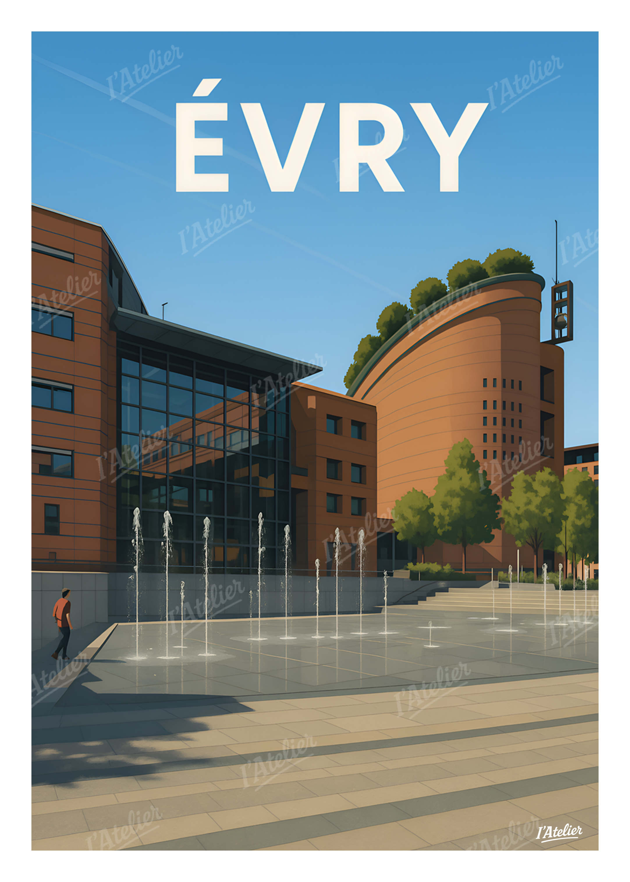 Plongez au cœur d’Évry avec cette affiche Évry signée I’Atelier, une illustration rétro qui célèbre l’architecture moderne et les lignes apaisantes de cette ville emblématique de l’Essonne. Entre façades orangées, jeux de reflets sur les vitres et fontaines qui s’élèvent au rythme du vent, cette scène évoque la douceur des promenades urbaines, la fraîcheur de l’eau en mouvement et la sérénité des grandes places ensoleillées. Un équilibre entre nature, design et lumière, idéal pour celles et ceux qui aiment les villes où l’humain respire au milieu de la modernité. Cette illustration au style vintage est imprimée en France sur un papier Mat haute qualité 170 g/m². Elle apporte à votre intérieur une atmosphère urbaine, lumineuse et apaisante, idéale pour personnaliser un salon, un bureau ou tout espace inspiré par la ville. Apportez une touche contemporaine d’Évry à votre décoration murale avec ce poster vintage signé I’Atelier.