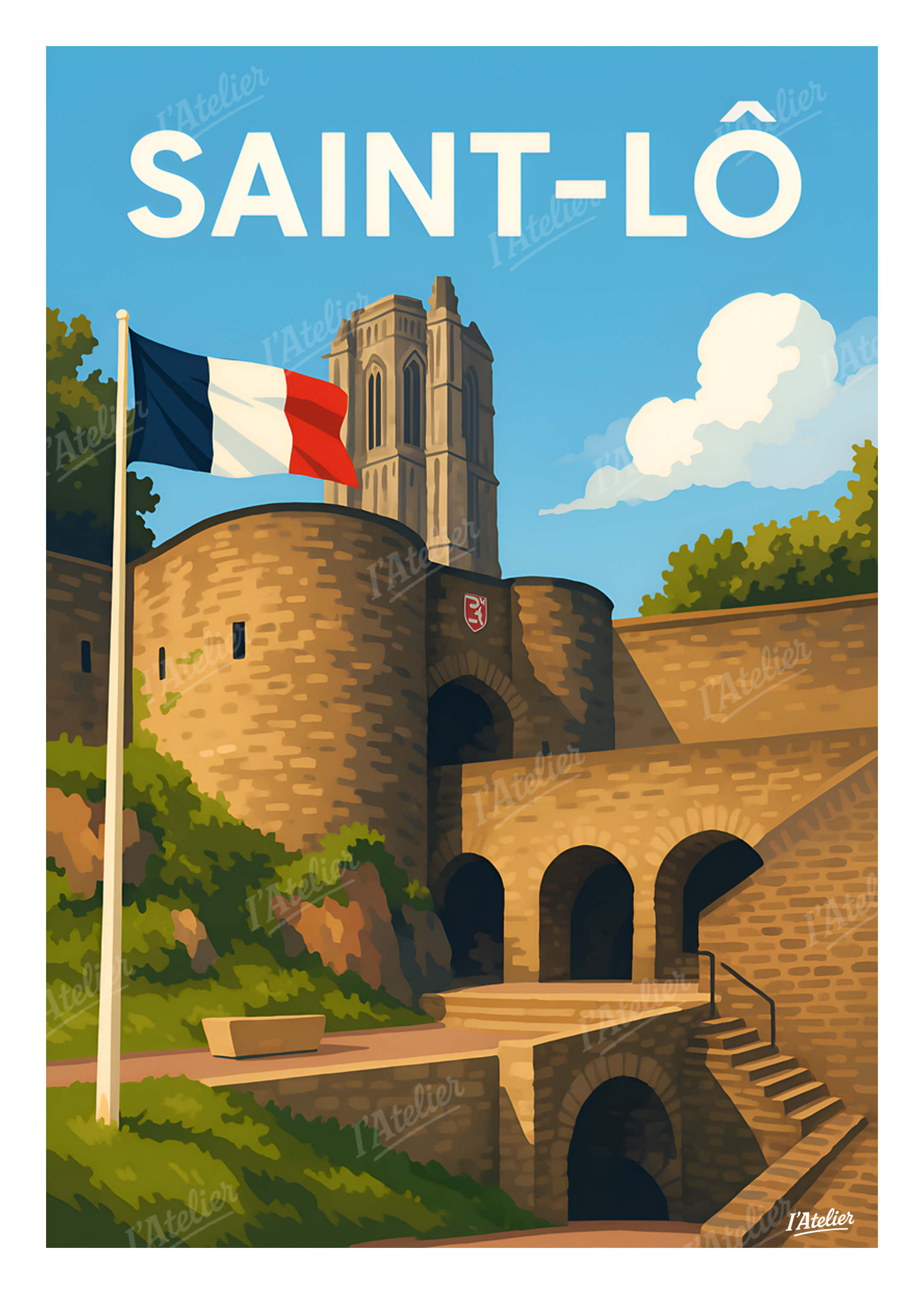 Plongez au cœur de Saint-Lô, cité normande chargée d’histoire, avec cette affiche décorative de I’Atelier, une illustration qui met en lumière ses remparts emblématiques et la silhouette majestueuse de son église dominant la ville. Entre pierres anciennes baignées de soleil, drapeau flottant dans l’air marin et jeux d’ombre sous les arches médiévales, cette scène raconte la force tranquille de la capitale des remparts. Une ambiance à la fois apaisante et vibrante, où l’on ressent le souffle de la Normandie et la douceur d’une promenade perchée au-dessus de la vallée. Cette illustration au style vintage est imprimée en France sur un papier Mat haute qualité 170 g/m². Elle apporte à votre intérieur une atmosphère harmonieuse, lumineuse et authentique, idéale pour personnaliser un salon, un bureau ou tout espace inspiré par la Normandie. Apportez une touche de caractère et d’élégance à votre décoration murale avec ce poster vintage Saint-Lô signé I’Atelier.