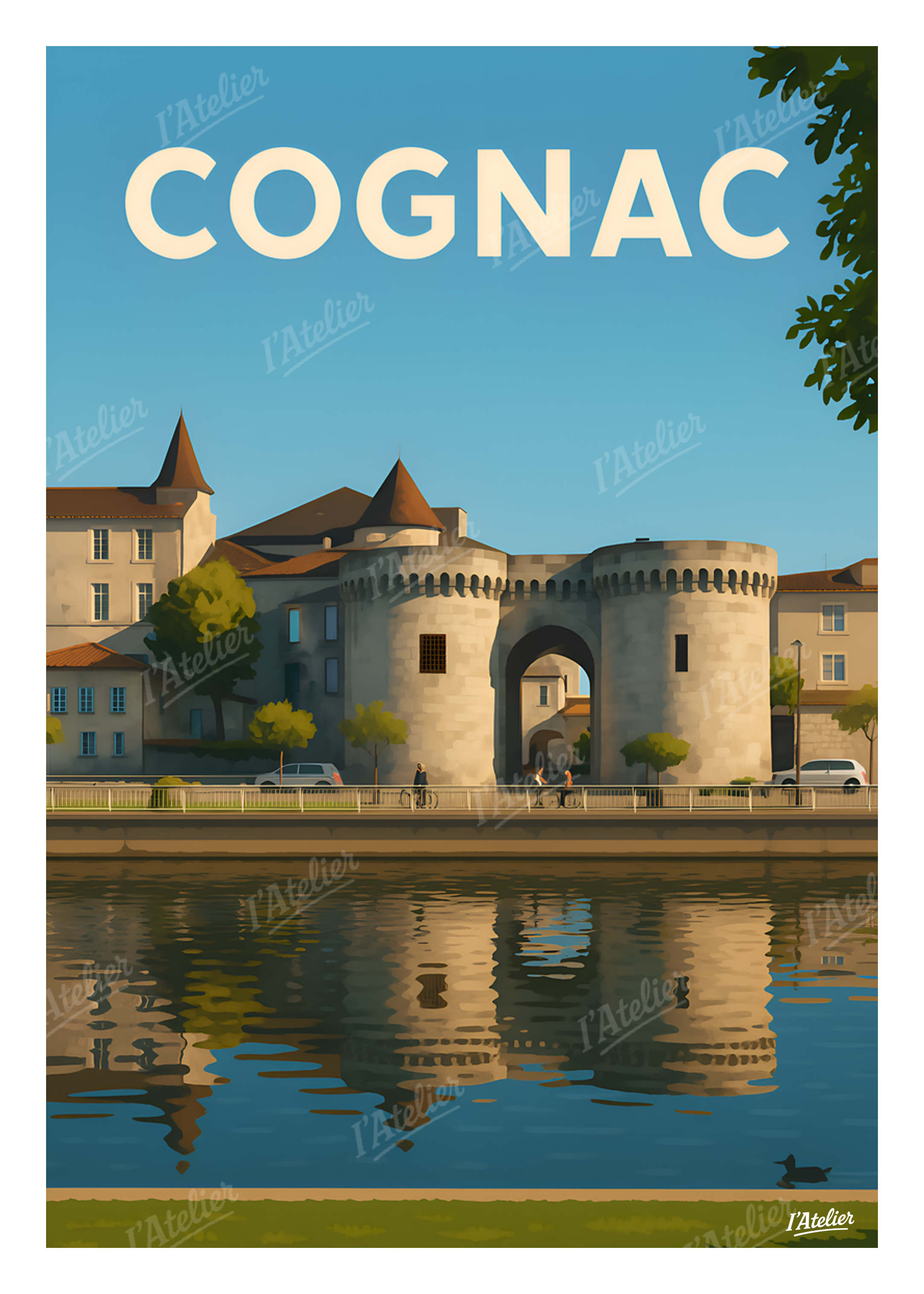 Plongez au cœur de Cognac avec cette affiche élégante de I’Atelier, une illustration rétro qui met en lumière la célèbre porte Saint-Jacques et les reflets paisibles de la Charente, pensée pour sublimer votre décoration murale. Entre pierres blanches baignées de soleil, silhouettes médiévales et eau miroitante, cette scène invite à flâner sur les quais, à sentir la douceur d’une fin d’après-midi charentaise et à retrouver l’atmosphère sereine d’une ville où le temps semble ralentir. Un poster vintage Cognac qui capture autant l’âme du fleuve que la poésie de ses lumières. Cette illustration au style vintage est imprimée en France sur un papier Mat haute qualité 170 g/m². Elle apporte à votre intérieur une atmosphère douce, lumineuse et harmonieuse, idéale pour personnaliser un salon, une chambre ou tout espace inspiré de vos voyages. Apportez une touche de charme charentais à votre intérieur avec cette affiche décorative signée I’Atelier.