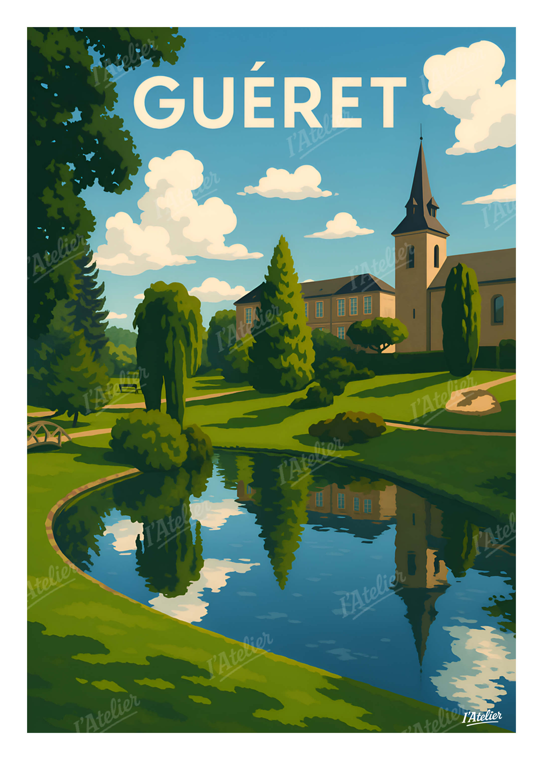 Plongez au cœur de Guéret avec cette affiche Guéret de I’Atelier, une illustration rétro qui met en lumière le charme paisible de cette ville nichée au cœur de la Creuse, parfaite pour une décoration murale élégante et intemporelle. Entre jardins soigneusement dessinés, eau calme reflétant les nuages et silhouettes élancées des arbres, cette scène évoque la tranquillité d’un après-midi d’été dans un parc creusois. On y ressent la fraîcheur des allées ombragées, le silence feutré des lieux historiques et cette douceur bucolique propre aux paysages du centre de la France. Cette illustration au style vintage est imprimée en France sur un papier Mat haute qualité 170 g/m². Elle apporte à votre intérieur une atmosphère douce, lumineuse et harmonieuse, idéale pour personnaliser un salon, une chambre ou tout espace inspiré des paysages français. Apportez une touche de sérénité et de poésie creusoise à votre intérieur avec ce poster vintage Guéret signé I’Atelier.