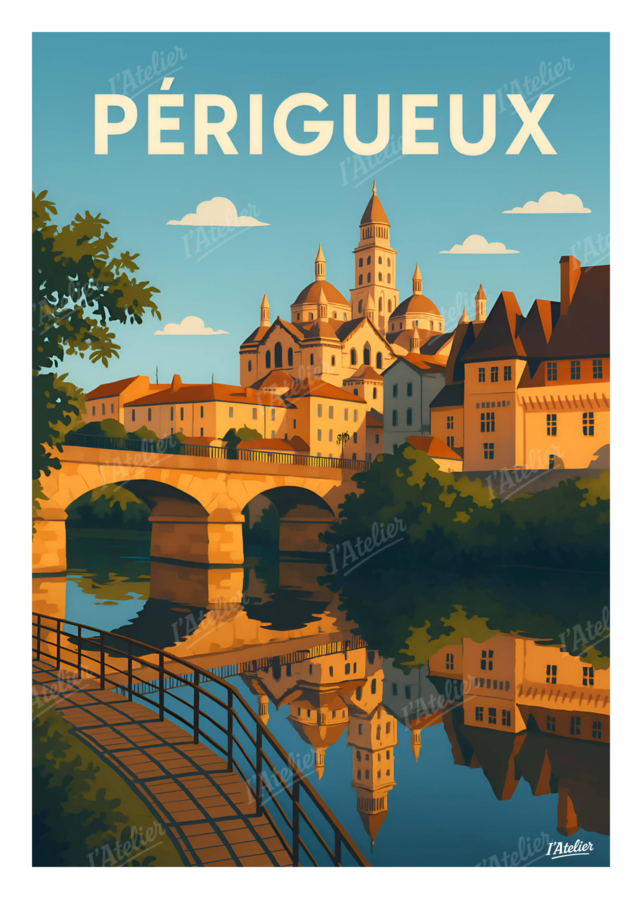 Plongez au cœur de Périgueux avec cette affiche vintage Périgueux signée I’Atelier, une illustration qui met en lumière le charme historique de la capitale périgourdine, entre rivière paisible et architecture emblématique. Au fil des reflets de l’Isle, la silhouette majestueuse de la cathédrale Saint-Front se dévoile, baignée d’une douce lumière dorée. Les toits ocres, le vieux pont et les ruelles bordées de maisons anciennes composent une scène apaisante, presque suspendue dans le temps. Une ambiance où flotte le parfum des soirées périgourdines, entre fraîcheur des berges et chaleur des pierres séculaires. Cette illustration au style vintage est imprimée en France sur un papier Mat haute qualité 170 g/m². Elle apporte à votre intérieur une atmosphère apaisante, lumineuse et raffinée, idéale pour personnaliser un salon, une chambre ou tout espace inspiré du patrimoine français. Apportez une touche de charme du Sud-Ouest à votre décoration grâce à cette illustration rétro de I’Atelier.
