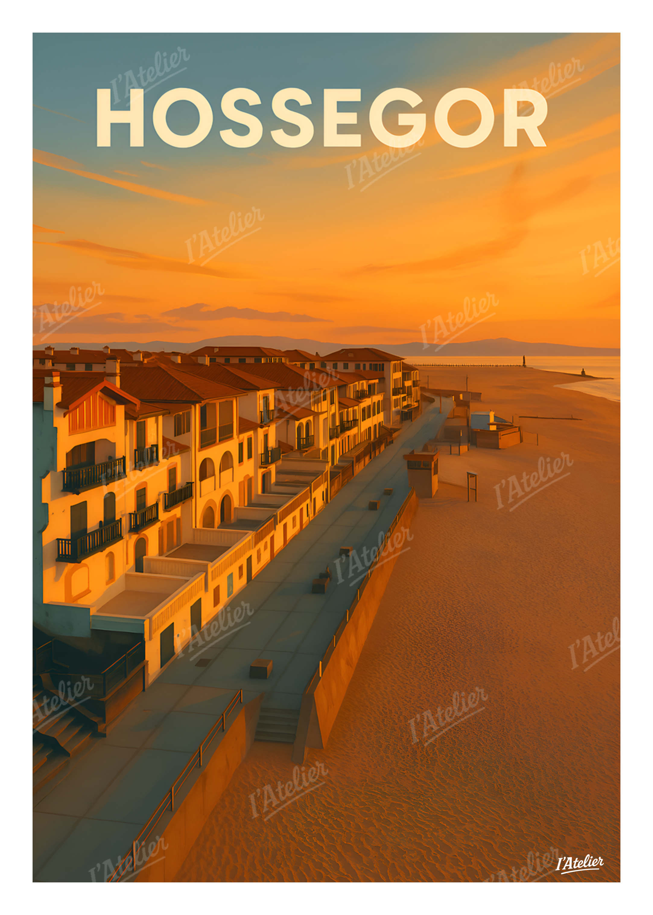 Plongez dans l’atmosphère élégante de la côte landaise avec cette affiche Hossegor, une création de I’Atelier qui révèle la douceur des fins de journée sur l’océan et l’architecture emblématique de la station balnéaire. Entre lumière dorée, façades aux accents basco-landais et horizon infini, cette scène capture la quiétude des promenades en bord de mer et le charme singulier d’Hossegor. On y ressent la chaleur du sable, le murmure des vagues et cette sensation de liberté propre aux longues soirées d’été sur la côte Atlantique. Cette illustration au style vintage est imprimée en France sur un papier Mat haute qualité 170 g/m². Elle apporte à votre intérieur une atmosphère douce, maritime et lumineuse, idéale pour personnaliser un salon, une chambre ou tout espace inspiré de l’océan. Apportez une touche de Hossegor à votre décoration murale avec cette illustration rétro signée I’Atelier.