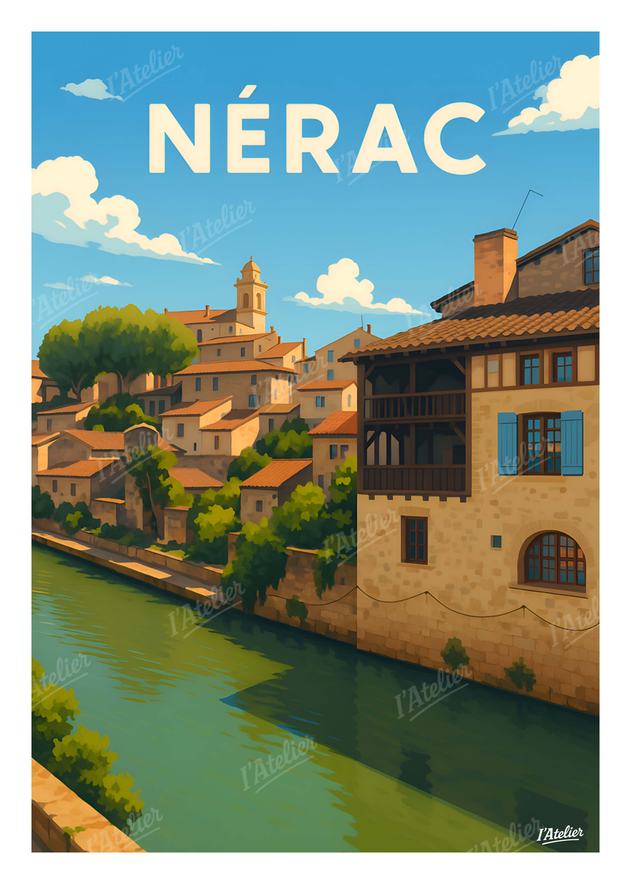 Plongez dans l’atmosphère ensoleillée de Nérac avec cette affiche Nérac signée I’Atelier, une création qui met en lumière le charme paisible de cette cité du Sud-Ouest, entre rivière scintillante et patrimoine historique. Au fil des berges de la Baïse, les maisons en pierre se reflètent dans l’eau calme tandis que les toits ocres et les volets colorés composent un décor chaleureux. On imagine la douceur du vent glissant le long des façades, les ruelles baignées de lumière, et ce sentiment d’apaisement qui émane de la ville. Une scène empreinte de poésie, parfaite pour une décoration murale inspirée des voyages et des instants suspendus. Cette illustration au style vintage est imprimée en France sur un papier Mat haute qualité 170 g/m². Elle apporte à votre intérieur une atmosphère douce, lumineuse et inspirante, idéale pour personnaliser un salon, une chambre ou tout espace dédié à l’art et à l’évasion. Apportez une touche de charme du Sud-Ouest à votre intérieur avec cette illustration rétro de Nérac.