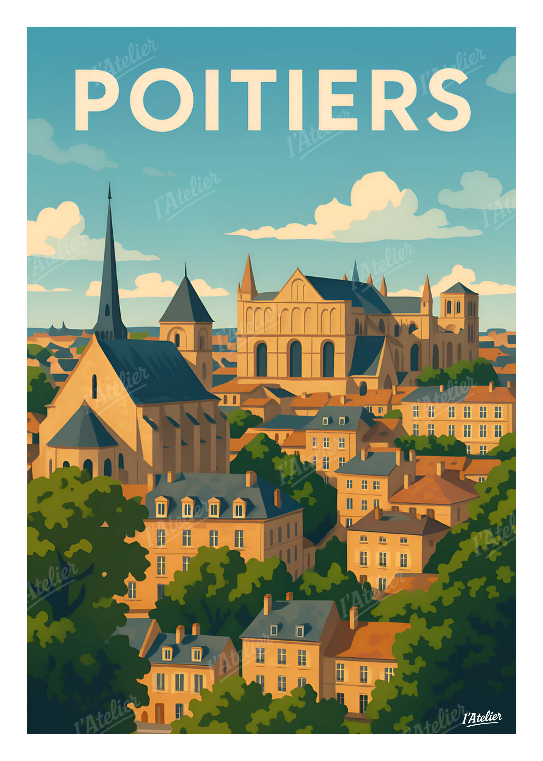 Plongez au cœur de Poitiers, cité d’histoire et de lumière, avec cette affiche Poitiers signée I’Atelier, une illustration rétro qui dévoile la silhouette emblématique de la ville entre toits ocres, flèches élancées et monuments baignés de douceur dorée. Sous un ciel limpide, les édifices médiévaux se dressent comme des gardiens du temps, entourés de ruelles paisibles et de jardins verdoyants. On y ressent le calme d’une fin d’après-midi, la chaleur des pierres blondes et l’atmosphère singulière d’une ville où chaque façade semble raconter une histoire. Une véritable invitation à la flânerie, idéale pour ceux qui aiment les paysages urbains empreints de poésie. Cette illustration au style vintage est imprimée en France sur un papier Mat haute qualité 170 g/m². Elle apporte à votre intérieur une atmosphère apaisante, authentique et lumineuse, idéale pour personnaliser un salon, une chambre ou tout espace inspiré par la richesse du patrimoine français. Apportez une touche de Poitiers à votre décoration murale grâce à cette illustration rétro signée I’Atelier.