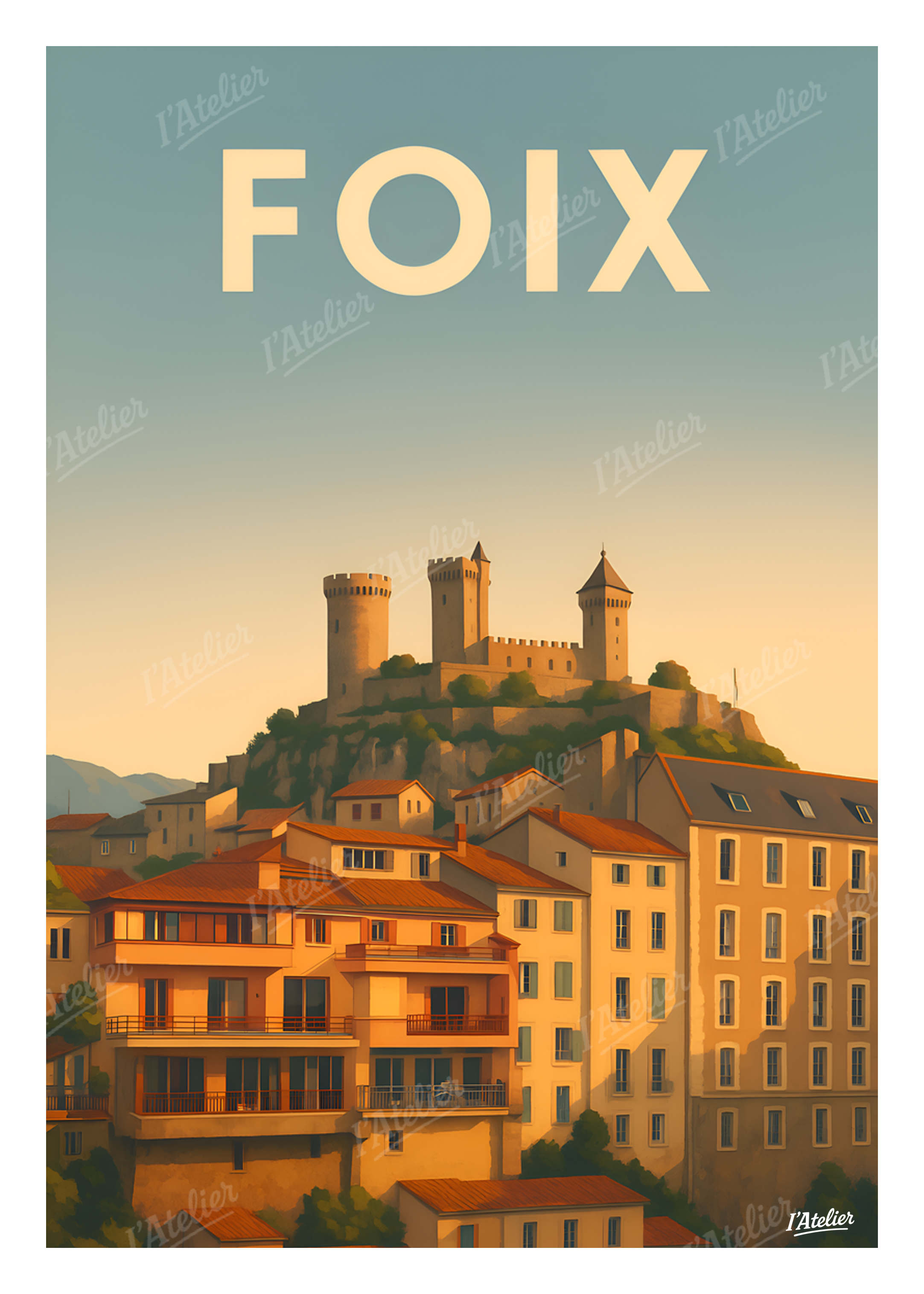 Plongez au cœur de Foix avec cette affiche délicatement illustrée, un hommage poétique à son château médiéval emblématique et aux toits colorés qui dominent la ville, idéal pour une décoration murale inspirée des paysages de l’Ariège et pour tout amateur de poster vintage. Entre lumière dorée, silhouettes des remparts et maisons perchées à flanc de colline, cette scène capture l’âme chaleureuse de Foix. On y devine le calme des ruelles anciennes, la douceur des fins d’après-midi et le charme d’une ville où l’histoire se mêle à la nature environnante. Une illustration qui évoque autant l’évasion que la sérénité. Cette illustration au style vintage est imprimée en France sur un papier Mat haute qualité 170 g/m². Elle apporte à votre intérieur une atmosphère douce, lumineuse et authentique, idéale pour personnaliser un salon, une chambre ou tout espace inspiré du Sud. Apportez une touche de caractère pyrénéen à votre intérieur avec cette affiche rétro signée I’Atelier.