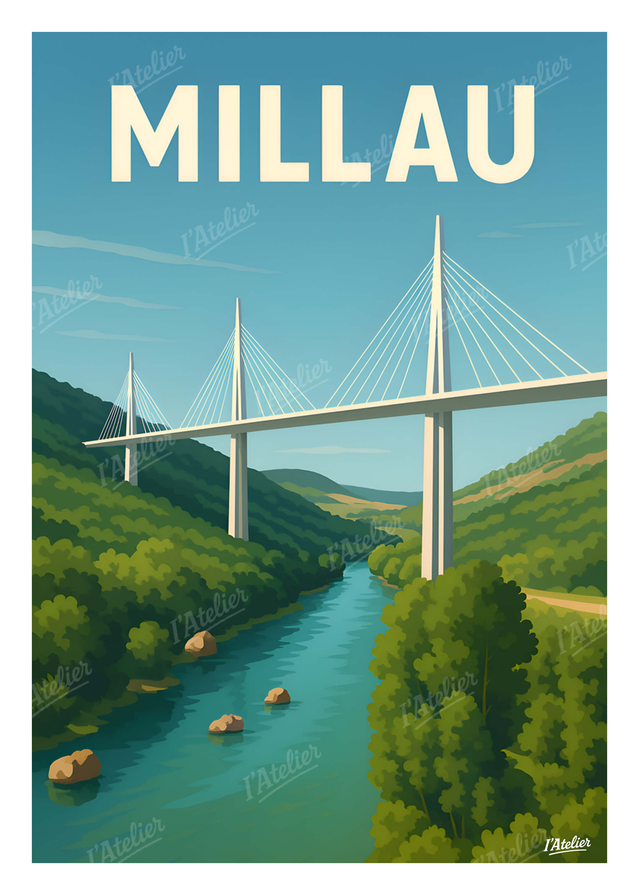 Plongez au cœur de Millau avec cette affiche vintage de I’Atelier, une illustration qui met en lumière la majesté de son célèbre viaduc, suspendu entre ciel et vallées verdoyantes, pour une décoration murale élégante et inspirante. Entre reliefs ondoyants, rivière scintillante et lignes élancées du pont, cette scène capture la quiétude de l’Aveyron et la sensation de liberté que l’on ressent face à cet ouvrage emblématique. Une atmosphère à la fois aérienne et apaisante, idéale pour ceux qui aiment les paysages grandioses et les voyages en pleine nature. Cette illustration au style vintage est imprimée en France sur un papier Mat haute qualité 170 g/m². Elle apporte à votre intérieur une atmosphère sereine, lumineuse et contemporaine, idéale pour personnaliser un salon, une chambre ou tout espace inspiré par l’esprit du voyage. Apportez une touche de Millau à votre intérieur grâce à cette illustration rétro signée I’Atelier.