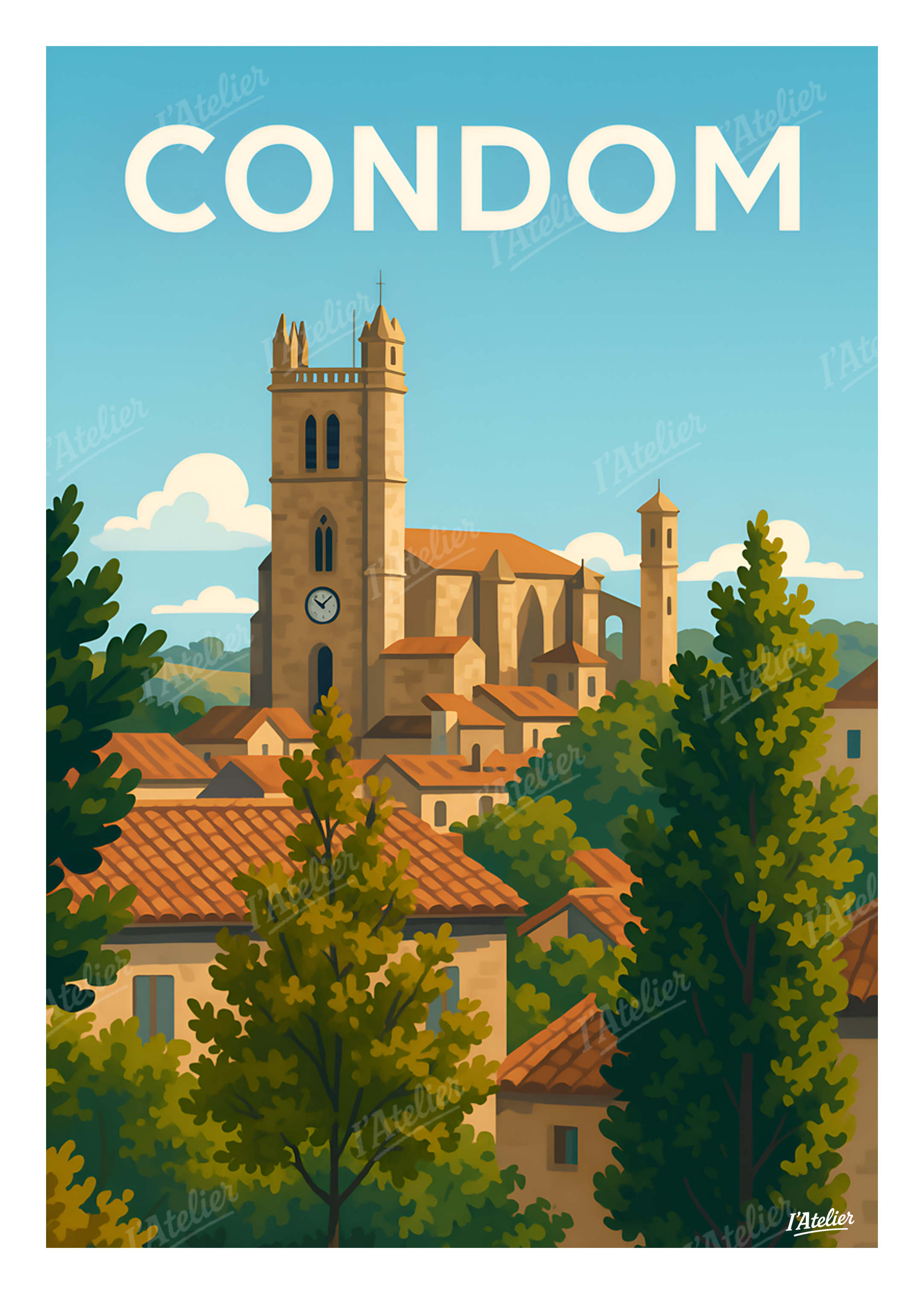 Plongez au cœur de la ville de Condom, joyau du Gers, avec cette affiche vintage de I’Atelier, une illustration qui met en lumière le charme intemporel de cette cité gasconne et de sa majestueuse cathédrale. Une affiche Condom idéale pour enrichir votre décoration murale d’une touche patrimoniale. Entre toits ocres, pierre blonde et verdure généreuse, ce poster vintage Condom capture l’atmosphère douce et lumineuse du Sud-Ouest. On y ressent la tranquillité des ruelles anciennes, le tintement lointain des cloches et la chaleur d’une fin de journée d’été, lorsque la ville s’apaise sous le ciel clair de Gascogne. Une illustration rétro qui invite au voyage, à la contemplation et aux souvenirs de balades en terres gasconnes. Cette illustration au style vintage est imprimée en France sur un papier Mat haute qualité 170 g/m². Elle apporte à votre intérieur une atmosphère apaisante, lumineuse et authentique, idéale pour personnaliser un salon, une chambre ou tout espace inspiré du Sud-Ouest. Apportez une touche de charme gascon à votre maison avec cette création rétro signée I’Atelier.