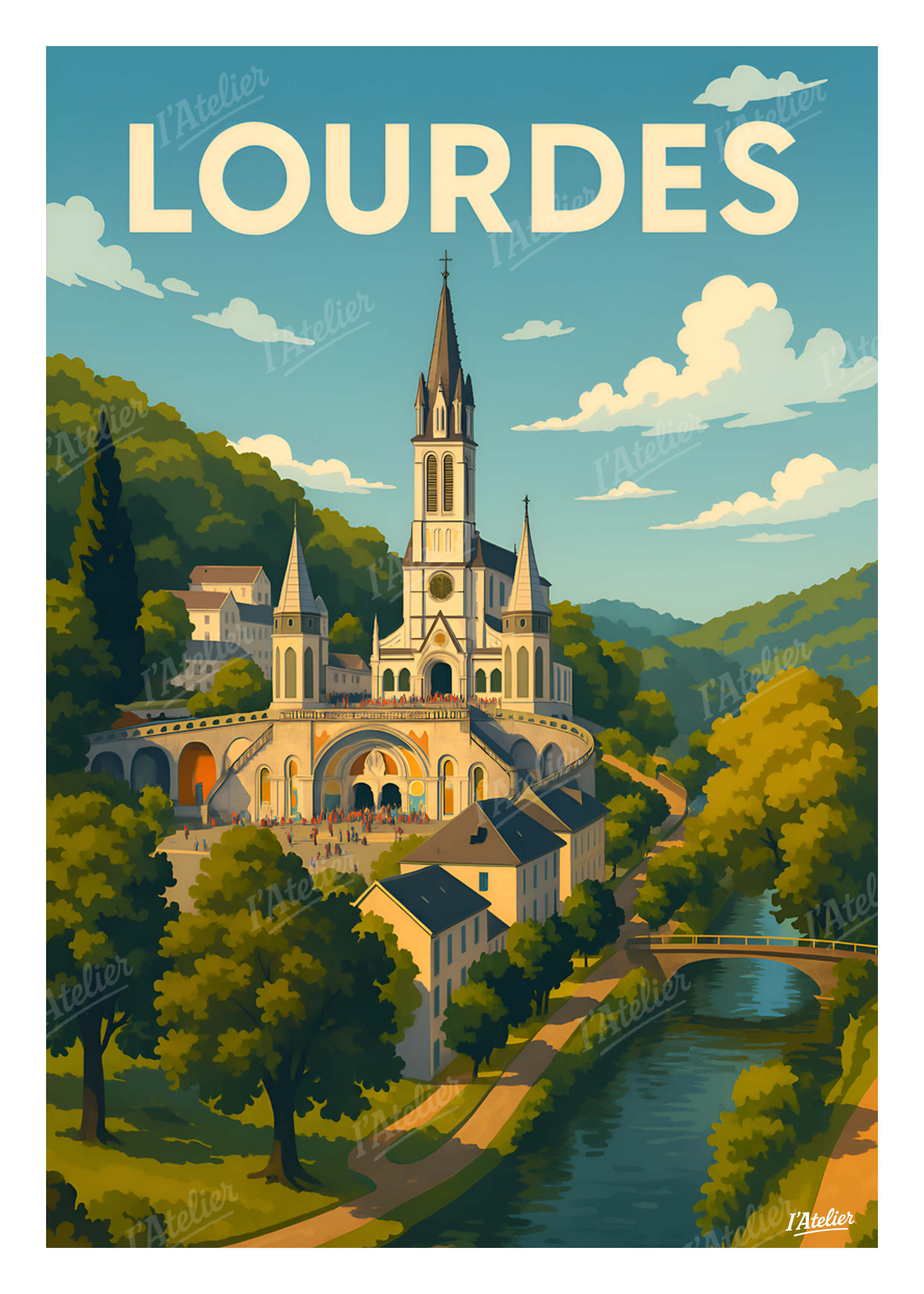 Plongez au cœur de Lourdes avec cette affiche vintage de I’Atelier, une illustration rétro qui met en lumière la majestueuse basilique et l’atmosphère apaisante de cette ville emblématique des Pyrénées. Entre les rives paisibles du Gave, les collines verdoyantes et l’élan spirituel qui anime le sanctuaire, cette scène évoque à la fois sérénité, ferveur et contemplation. Une ambiance douce où le murmure de l’eau et la beauté architecturale se mêlent pour offrir un véritable moment d’évasion. Cette illustration au style vintage est imprimée en France sur un papier Mat haute qualité 170 g/m². Elle apporte à votre intérieur une atmosphère harmonieuse, lumineuse et inspirante, idéale pour personnaliser un salon, une chambre ou tout espace dédié au voyage et au patrimoine. Apportez une touche de poésie et d’évasion à votre décoration murale grâce à cette affiche Lourdes signée I’Atelier.