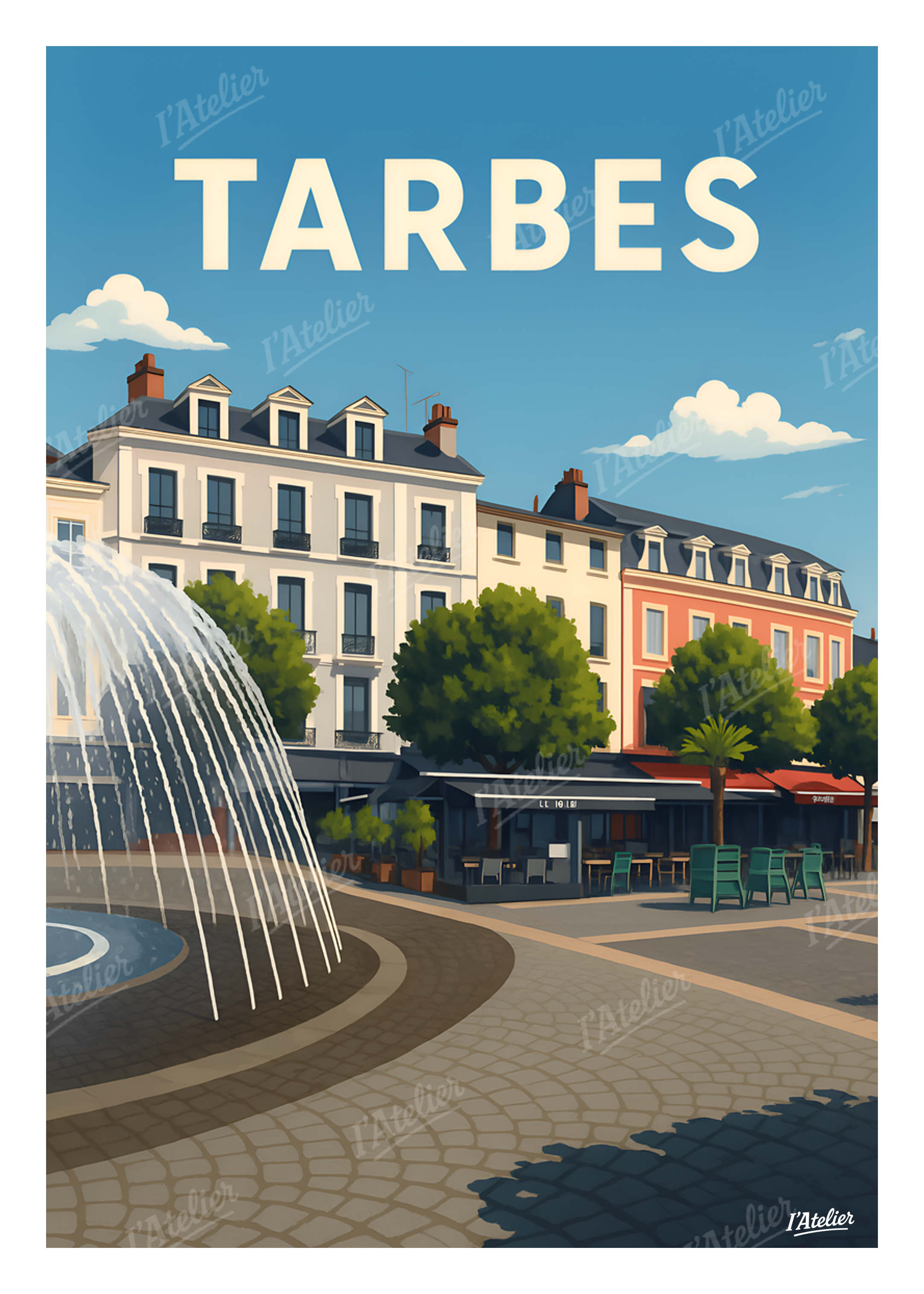 Plongez au cœur de Tarbes avec cette affiche vintage de I’Atelier, une illustration qui met en lumière l’élégance de la place centrale, entre architecture classique et ambiance méridionale idéale pour une décoration murale raffinée. Sous le ciel limpide des Hautes-Pyrénées, la scène révèle la douceur d’un après-midi en terrasse, le murmure de la fontaine et la quiétude des façades colorées. Une atmosphère vivante et apaisante, où l’ombre des arbres et les reflets de l’eau invitent à flâner au rythme de la ville. Cette illustration au style vintage est imprimée en France sur un papier Mat haute qualité 170 g/m². Elle apporte à votre intérieur une atmosphère douce, lumineuse et harmonieuse, idéale pour personnaliser un salon, une chambre ou tout espace inspiré d’un esprit urbain du Sud. Laissez entrer l’âme chaleureuse de Tarbes chez vous grâce à cette illustration rétro signée I’Atelier.