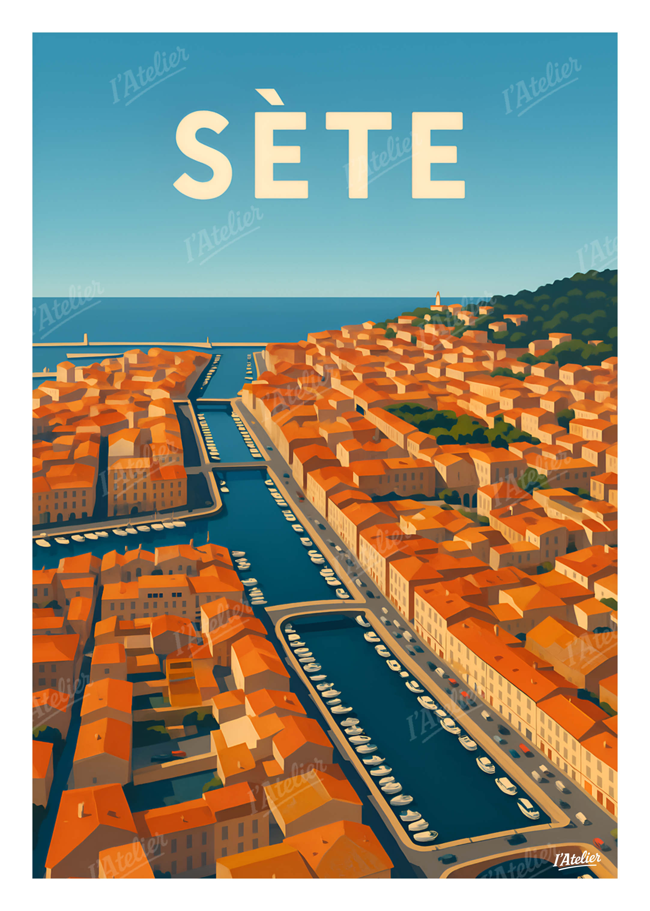 Plongez au cœur de Sète, cité maritime au charme ensoleillé, avec cette affiche Sète signée I’Atelier, un poster vintage qui révèle la lumière unique du littoral languedocien et l’élégance de ses canaux ouverts sur la Méditerranée. Entre toits ocres, bateaux alignés le long du canal Royal et ruelles baignées d’embruns, cette scène évoque l’effervescence douce d’un port vivant, le murmure de l’eau contre les quais et la chaleur tranquille des fins de journée d’été. Une ambiance lumineuse et authentique, parfaite pour une décoration murale inspirée du Sud. Cette illustration au style vintage est imprimée en France sur un papier Mat haute qualité 170 g/m². Elle apporte à votre intérieur une atmosphère lumineuse, méditerranéenne et harmonieuse, idéale pour personnaliser un salon, une chambre ou tout espace inspiré du bord de mer. Laissez entrer l’esprit ensoleillé de la Ville Singulière dans votre maison avec cette illustration rétro signée I’Atelier.