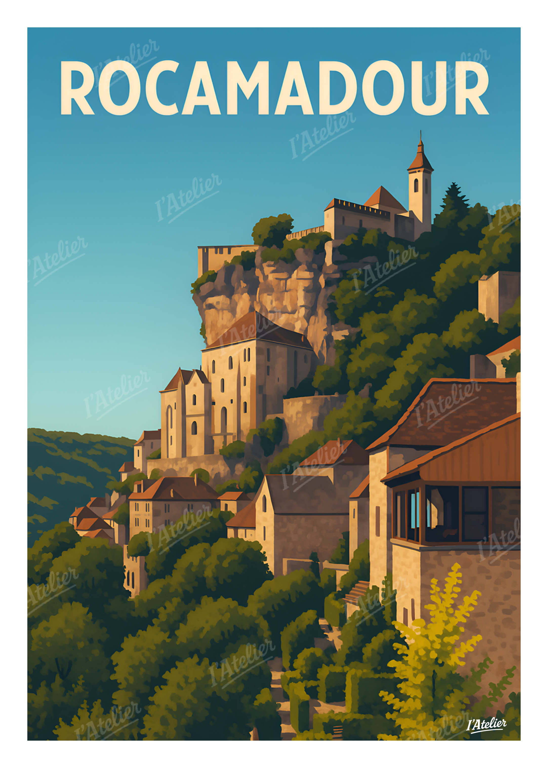 Plongez au cœur de Rocamadour, village emblématique du Lot perché à flanc de falaise, avec cette affiche Rocamadour de I’Atelier, une création qui célèbre la magie de ce sanctuaire médiéval suspendu entre ciel et vallée. Entre maisons de pierre accrochées au rocher, sanctuaires millénaires et lumière dorée du soir, cette scène évoque le silence des ruelles anciennes, le parfum des forêts environnantes et la sérénité qui émane de ce lieu spirituel. Un voyage visuel où patrimoine, nature et histoire se mêlent en harmonie. Cette illustration au style vintage est imprimée en France sur un papier Mat haute qualité 170 g/m². Elle apporte à votre intérieur une atmosphère douce, lumineuse et intemporelle, idéale pour personnaliser un salon, une chambre ou tout espace inspiré des voyages. Apportez une touche de Rocamadour et d’élégance rétro à votre décoration murale.