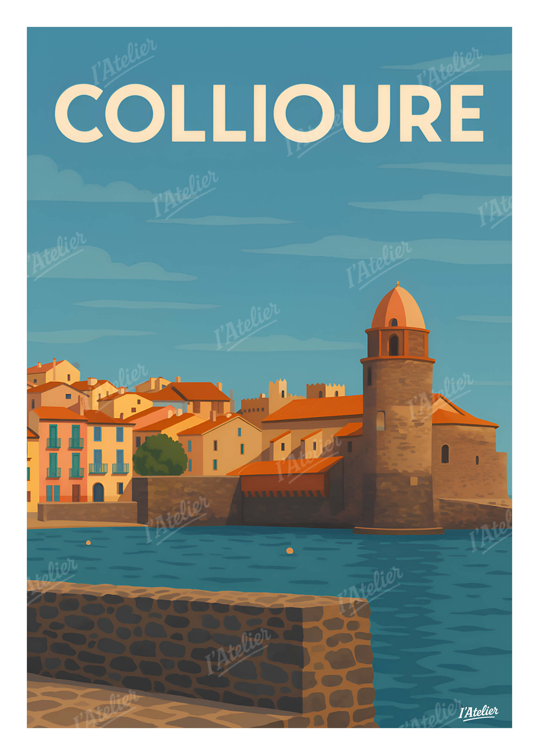 Plongez au cœur de Collioure, joyau de la Côte Vermeille, avec cette affiche vintage de I’Atelier, un poster décoratif qui capture l’âme lumineuse du village méditerranéen et la douceur de son bord de mer. Entre les façades colorées, les toits ocres baignés de soleil et le clocher emblématique se reflétant dans les eaux calmes du port, cette illustration rétro évoque l’animation des ruelles, le parfum salin de la Méditerranée et la poésie singulière de ce village d’artistes. Une invitation à flâner, à contempler et à ressentir la sérénité du Sud. Cette illustration au style vintage est imprimée en France sur un papier Mat haute qualité 170 g/m². Elle apporte à votre intérieur une atmosphère lumineuse, méditerranéenne et apaisante, idéale pour personnaliser un salon, une chambre ou tout espace inspiré du Sud. Laissez entrer l’éclat de Collioure dans votre décoration murale avec cette affiche signée I’Atelier.